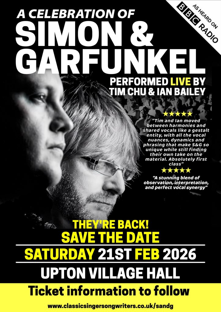 Tim Chu and Ian Bailey are returning to UVH on Saturday 21st February 2026 to sing the works of Simon and Garfunkel. Tickets (£15 adults, £7.50 children) are on sale NOW via UVHevents@gmail.com or 07712611616. The bar will be open.