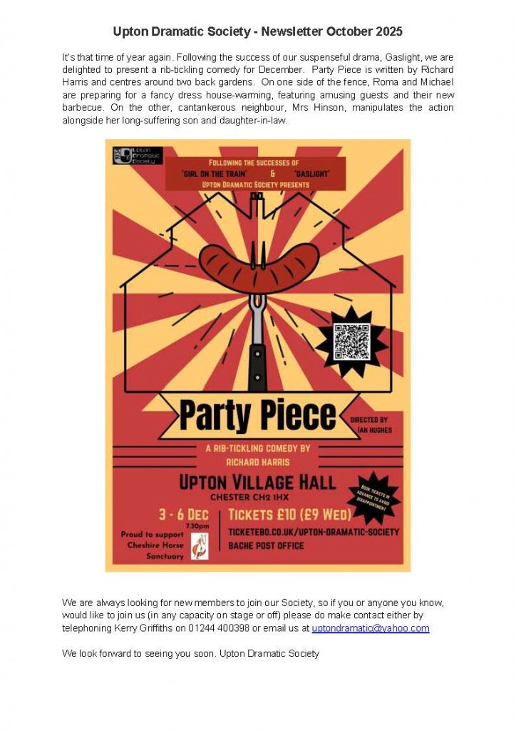 The next Upton Dramatic Society production from 3rd to 6th December will be a comedy – “Party Piece”. Tickets from ticketebo.co.uk/upton-dramatic-society or Bache Post Office NOT from UVH. See their newsletter for details. The bar will be open – plus tea and coffee in the interval.