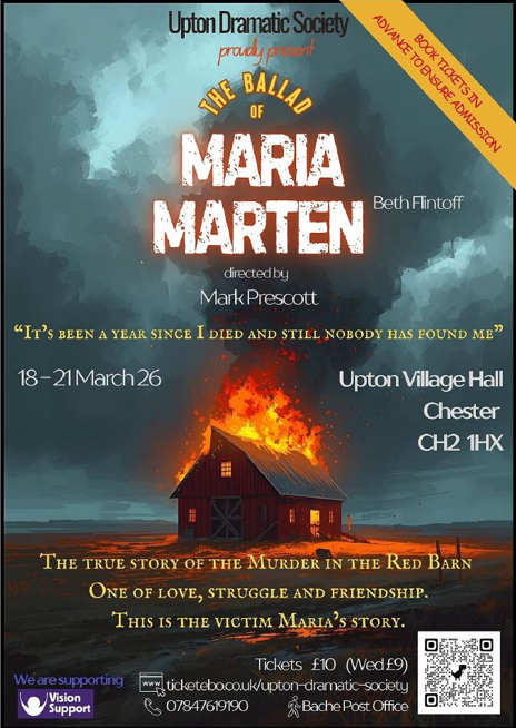 The next Upton Dramatic Society production of The Ballad of Maria Marten will take place between 18th and 21st March 2026. You will be taken back to 1820s Polstead for this tale of love, struggle and friendship. Tickets are available NOW from ticketebo.co.uk/upton-dramatic-society via the flame-coloured button below or Bache Post Office (NOT from UVH events).