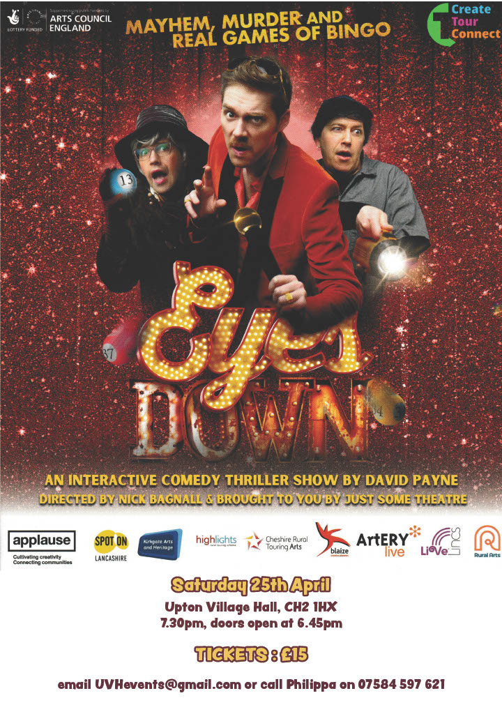 After Easter, on Saturday 25th April 2026, why not join us for some games of bingo, combined with a murder mystery? Our next CRTA production of “Eyes Down” will definitely be something different! Tickets can be bought online (with a booking fee) from the CRTA website via the green button below. Otherwise, tickets cost £15 via UVHevents@gmail.com as usual, or contact Philippa on 07584 597621. Please note the new contact details.
